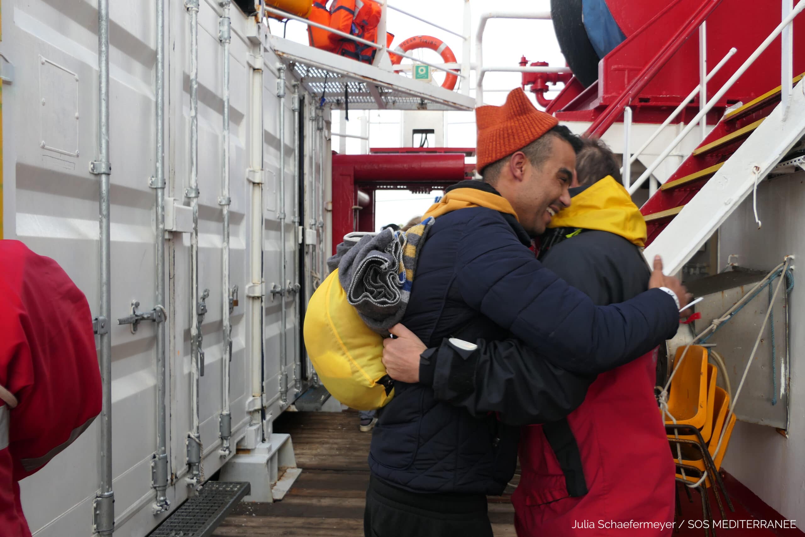 « Les jours de débarquement sont toujours sous tension et chargés en émotions. Tout le monde est soulagé, bien sûr, mais il règne aussi parmi les rescapés une certaine incertitude et de l’appréhension quant à leur avenir. Ma photo préférée de la semaine dernière raconte une scène d’adieu – une étreinte qui signifie ‘prenez soin de vous’. »