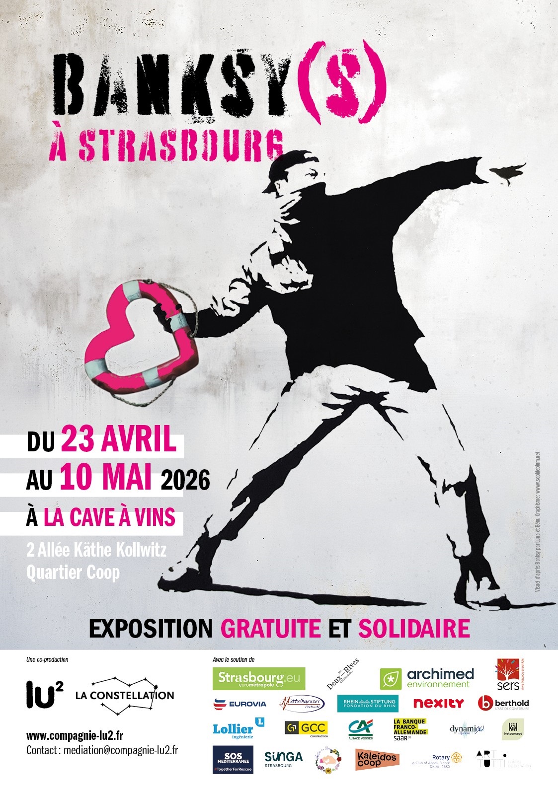 Du 23 avril au 10 mai, dans le cadre du festival Kaleidoscoopie, en partenariat avec lu2 et la Constellation, La Cave à Vins à Strasbourg accueille BANKSY(S) : une exposition autour du street-artist Banksy, à laquelle SOS MEDITERRANEE est associée.