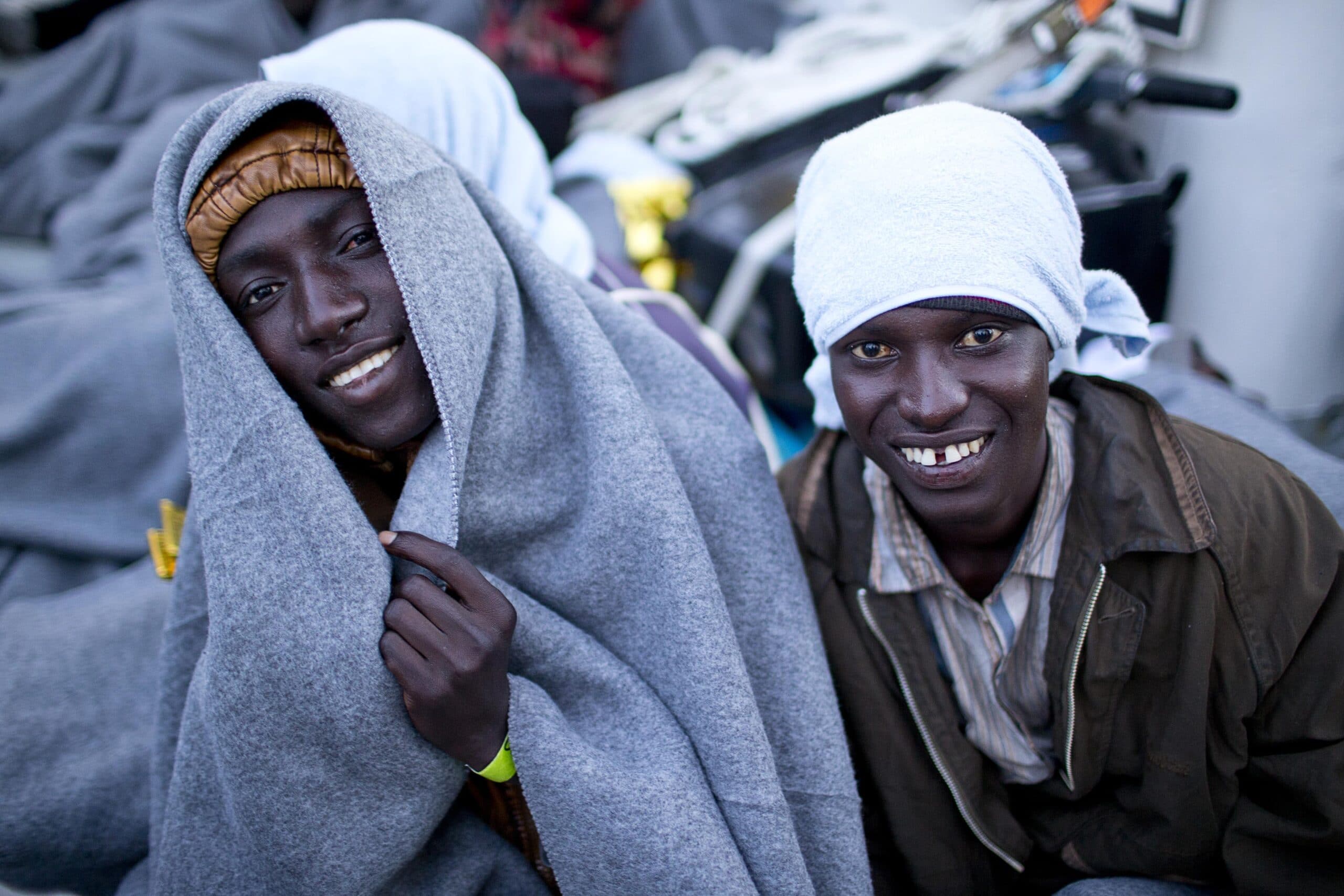 Le bateau glisse sur une mer d’huile et dépasse la statue dorée du Christ qui marque l’entrée du port de Messine. Avant l’arrivée, on transfère une partie des migrants sur le pont supérieur pour que les marins puissent procéder aux manœuvres d’amarrage et dégager la passerelle qui sera jetée sur le quai. Recueillement et émotion se lisent sur les visages, mais aussi une certaine inquiétude, surtout lorsque la procédure avec les autorités sanitaires, qui précède le débarquement, se prolonge pendant une heure. Certains redoutent qu’on leur refuse l’entrée du territoire, tous leurs espoirs sont accrochés à cette terre d’Italie… Nombreux se sont enroulés dans leur couverture malgré le soleil éclatant, ils portent tous le petit sac de toile remis par Médecins du Monde où ils ont emporté serviette et couverture. Les petites Nour et Riya serrent leurs peluches dans les bras. Pour beaucoup, il y a aussi l’excitation d’un inconnu prometteur.