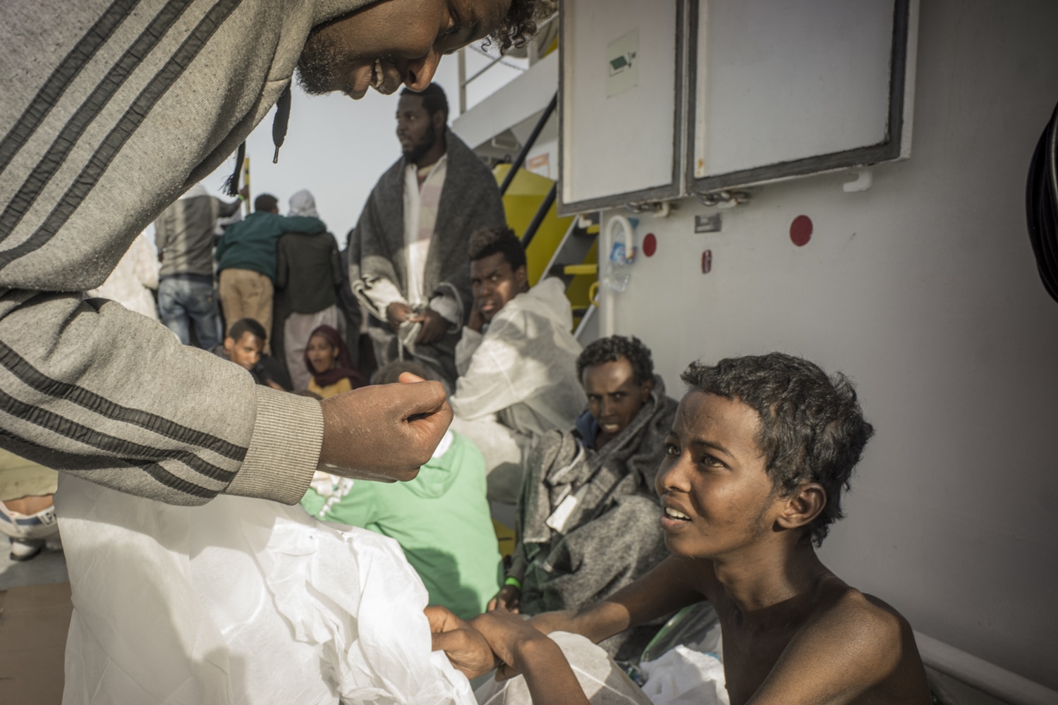 Hamid, 16 ans, de Somalie, a quitté la maison de sa famille à l’âge de 12 ans, seul. Par voie d’un interprète, il explique qu’il avait l’intention de voyager avec des amis, mais finalement il était le seul à partir. Il a pris trois semaines pour passer par le Soudan du Sud et l’Éthiopie pour arriver en Libye. Il a passé trois ans en Libye, où un groupe de travailleurs soudanais l’ont aidés à trouver un travail. Il a été employé sur une ferme. Il a été arrêté et a passé six mois en prison. « Ils étaient des gens du gouvernement, ils ont arrêté seulement les Noirs qui passaient. Ils ont pris mon passeport et mes papiers. J’ai passé six mois en prison, sans nourriture, sans médicaments, c’était comme un mauvais rêve. Mais c’était seulement six mois.»